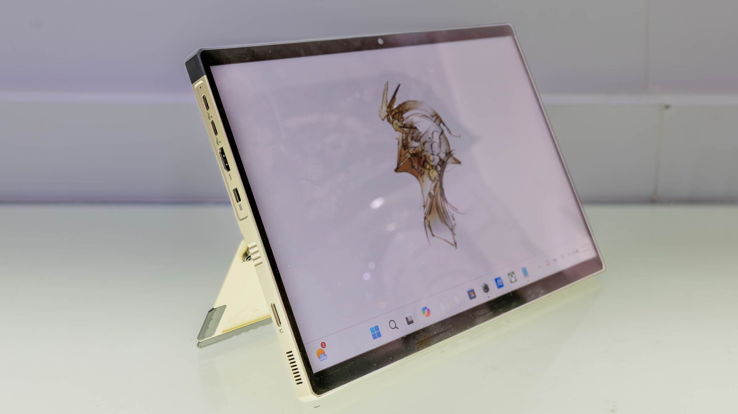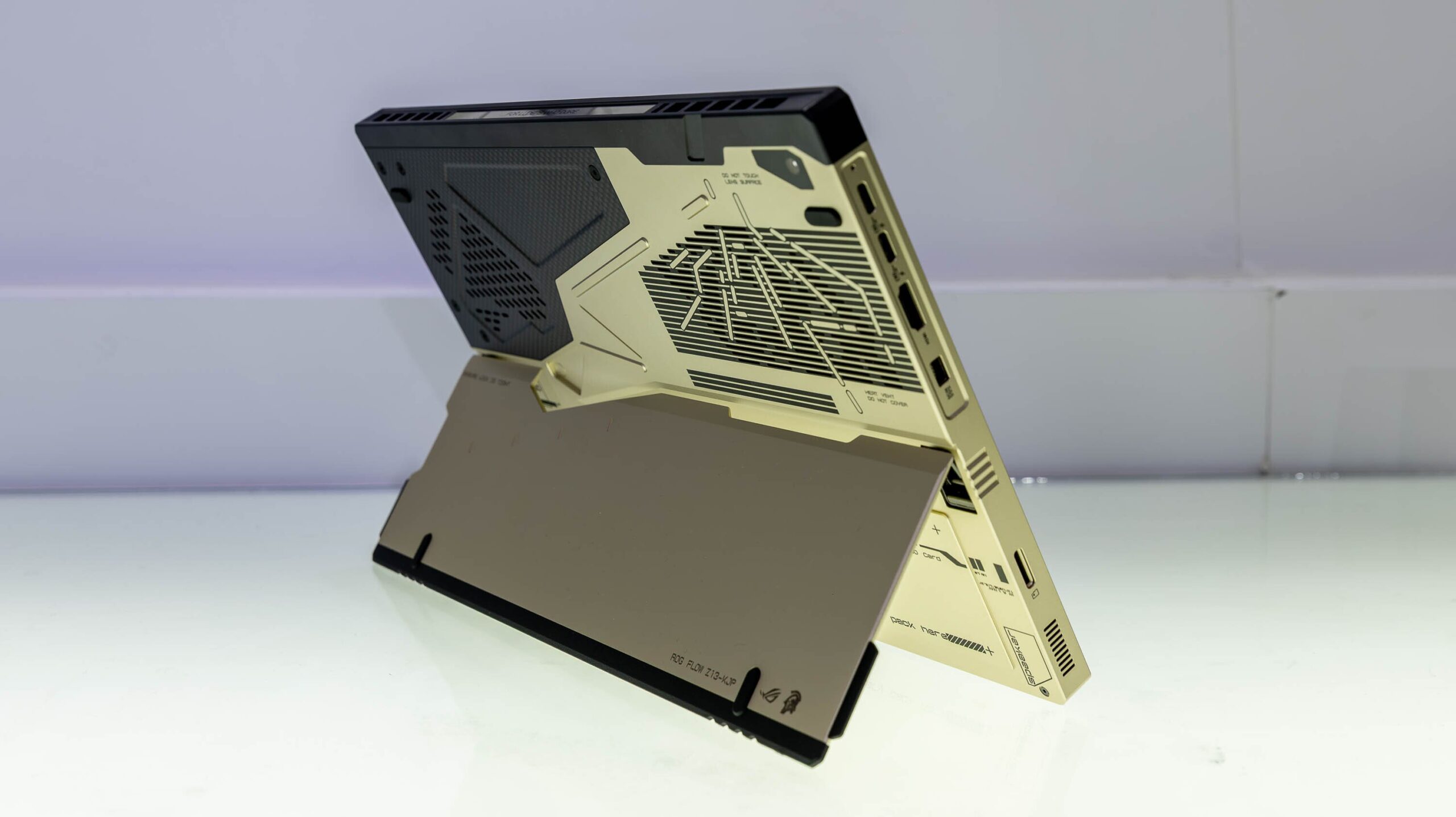 我尤其喜欢机身背面和底部的设计。散热孔周围的黑金饰条,加上“散热孔/请勿遮盖”等小字警告,赋予了这款笔记本电脑一种军事风格。碳纤维机身进一步强化了这种随时准备投入战斗的感觉。(但不要被它的外观所迷惑:ROG Flow Z13 并没有获得军规认证。)