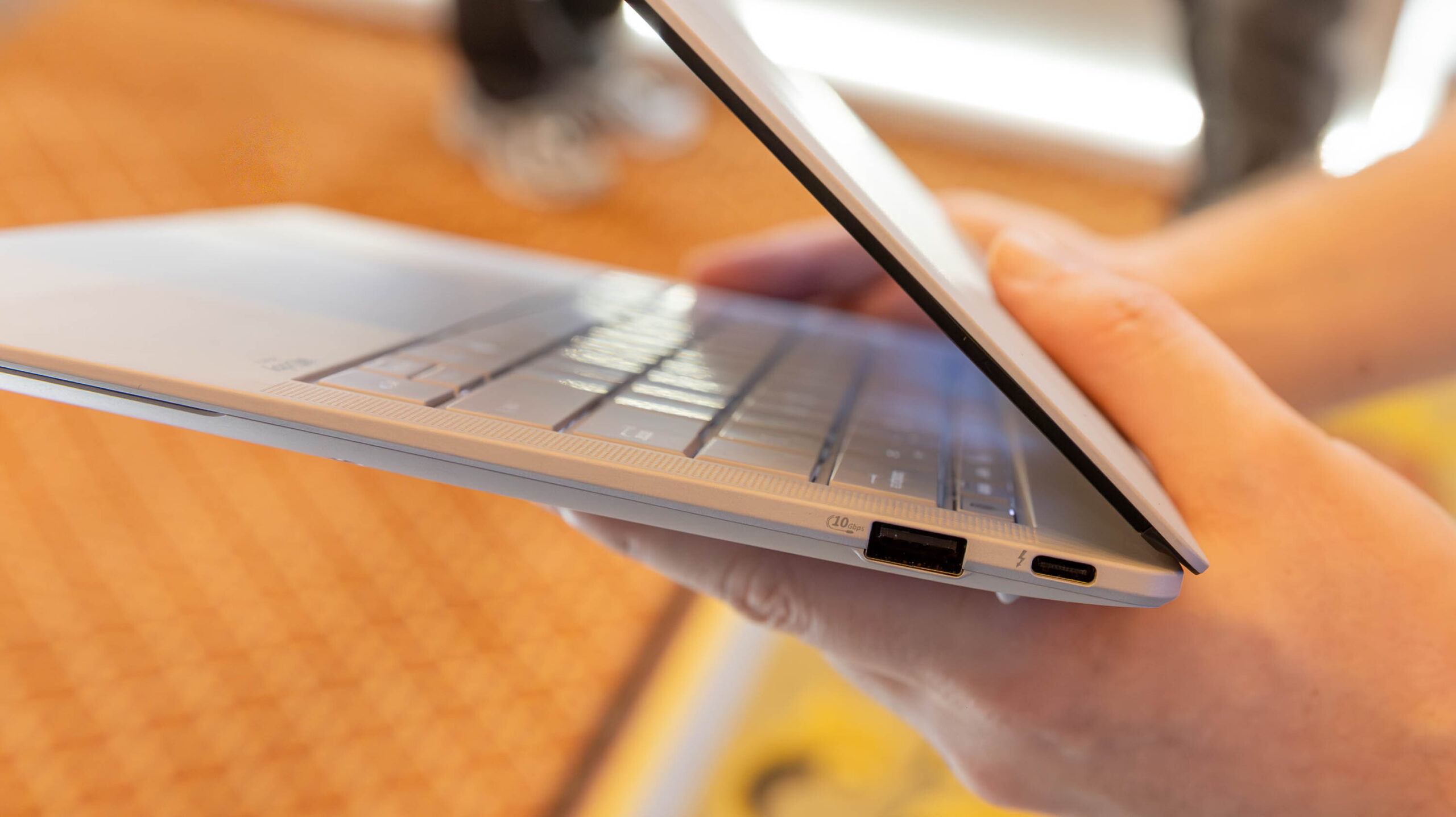 环顾机身,你可能会惊讶于如此纤薄的笔记本电脑竟然配备了如此丰富的接口。它配备了两个 Thunderbolt/Type-C 接口(分别位于机身两侧),支持数据传输、视频输出和充电。此外,机身两侧还各有一个普通的 USB Type-A 接口,左侧还有一个全尺寸 HDMI 输出接口和一个耳机插孔。USB-A 和 HDMI 接口尤其值得称道,因为它们确保了与旧款外设的兼容性,无需使用转接器。