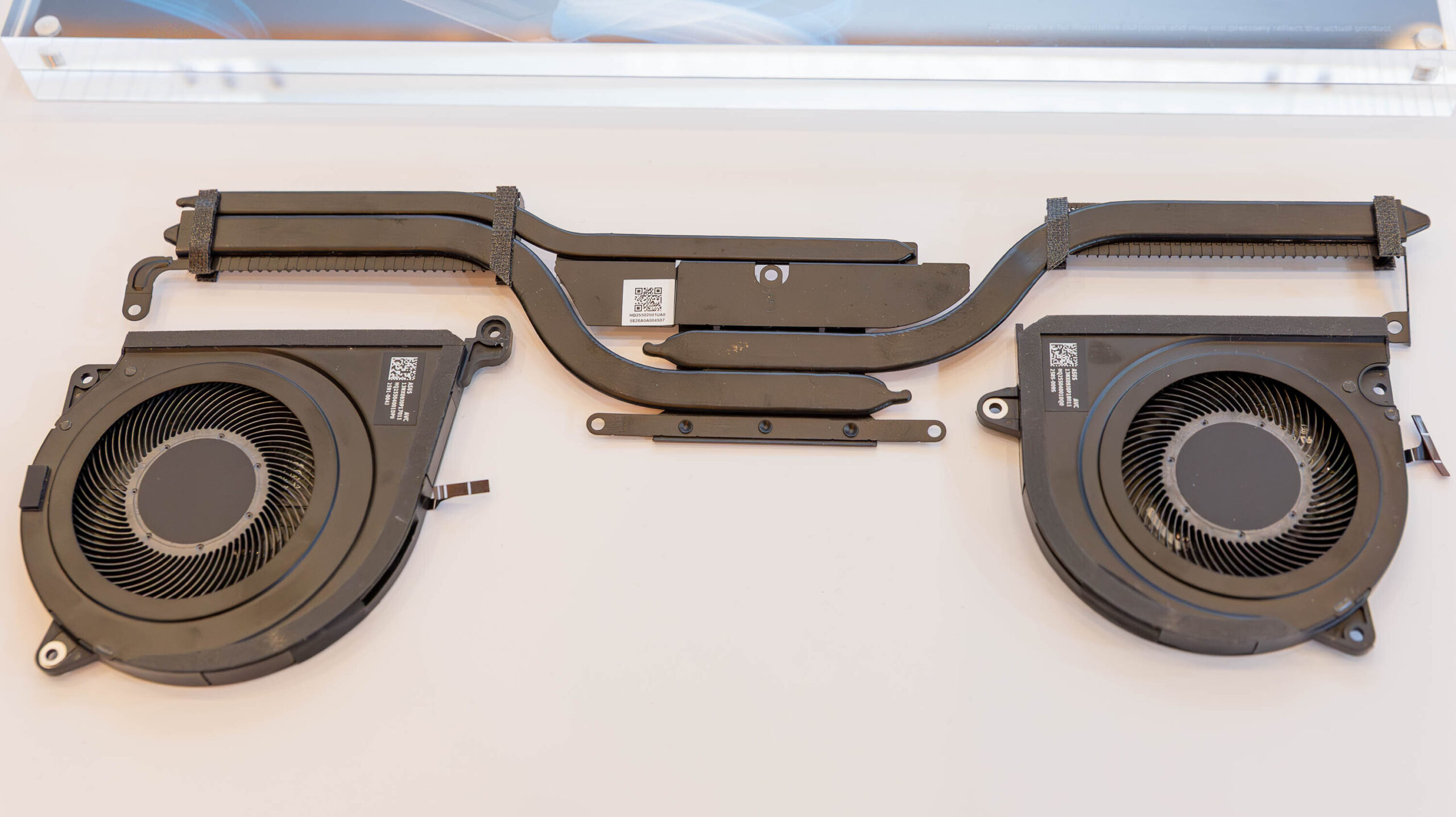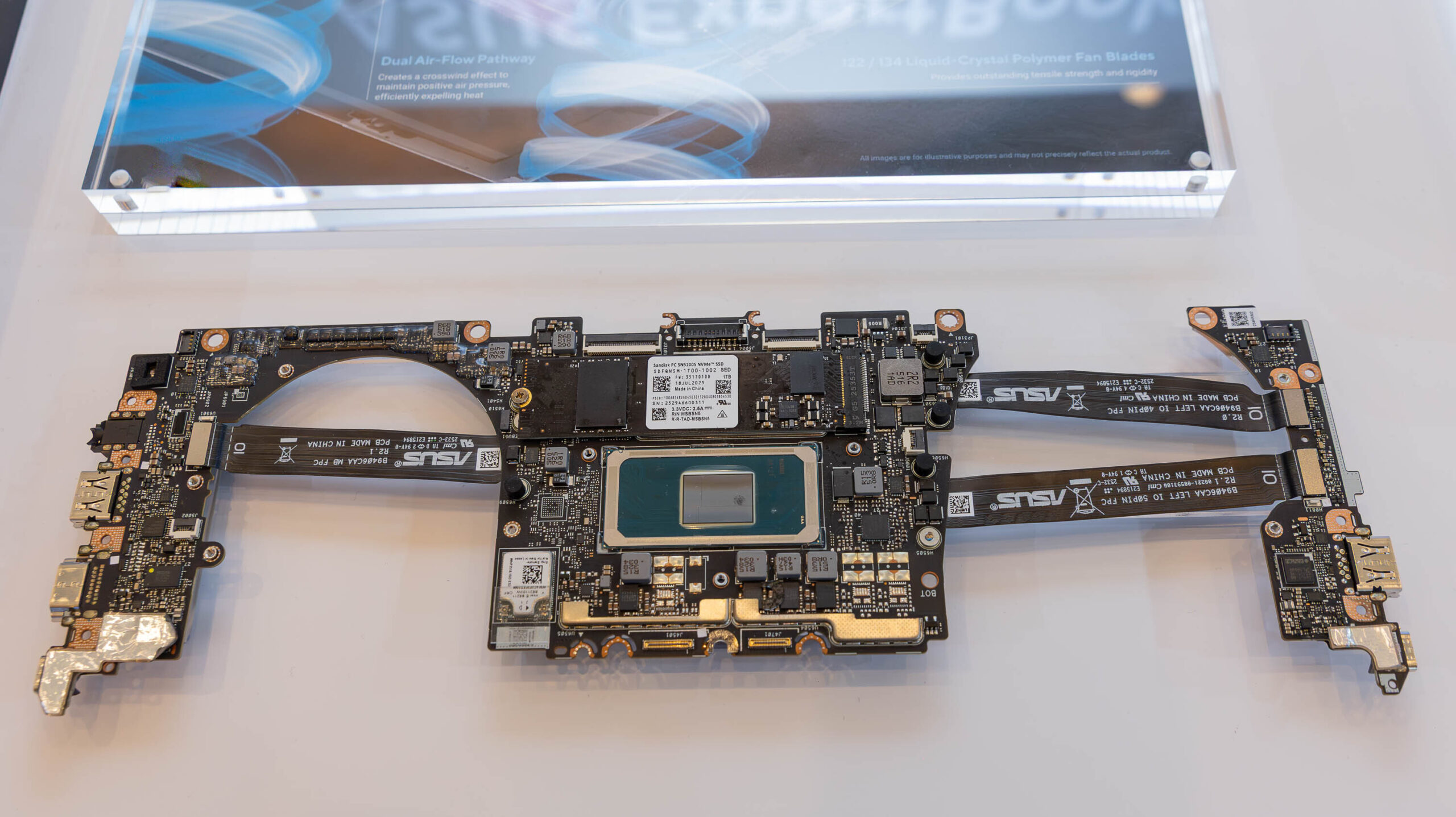 该散热系统采用三根热管和尺寸显著增大的风扇,以高效地输送空气。为了节省PCB空间,内存被放置在固态硬盘下方。此外,尽管尺寸较大的风扇占据了相当大的内部空间,华硕仍然为其配备了一块更紧凑、密度更高的70Wh电池。这得益于先进的电池化学技术,确保了电池容量无需为了散热系统而牺牲。
