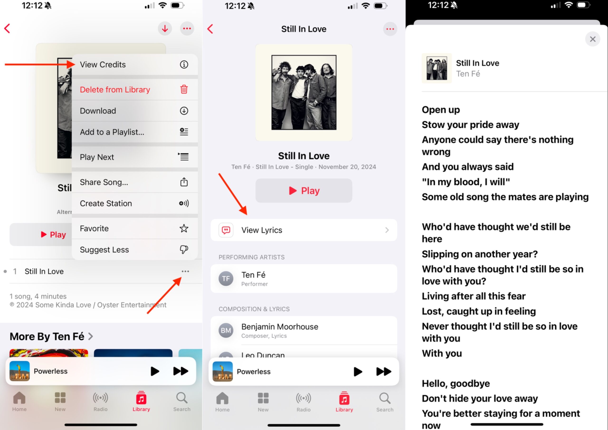 播放歌曲时,您可以轻松查看歌词;在“正在播放”界面,点击歌词气泡图标即可。如果您想在不播放歌曲的情况下查看歌词,也可以点击歌曲旁边的三点菜单,然后选择“查看制作人员名单”。如果歌曲有歌词,则“查看歌词”选项会显示在“播放”按钮下方。